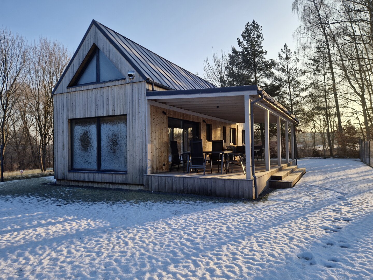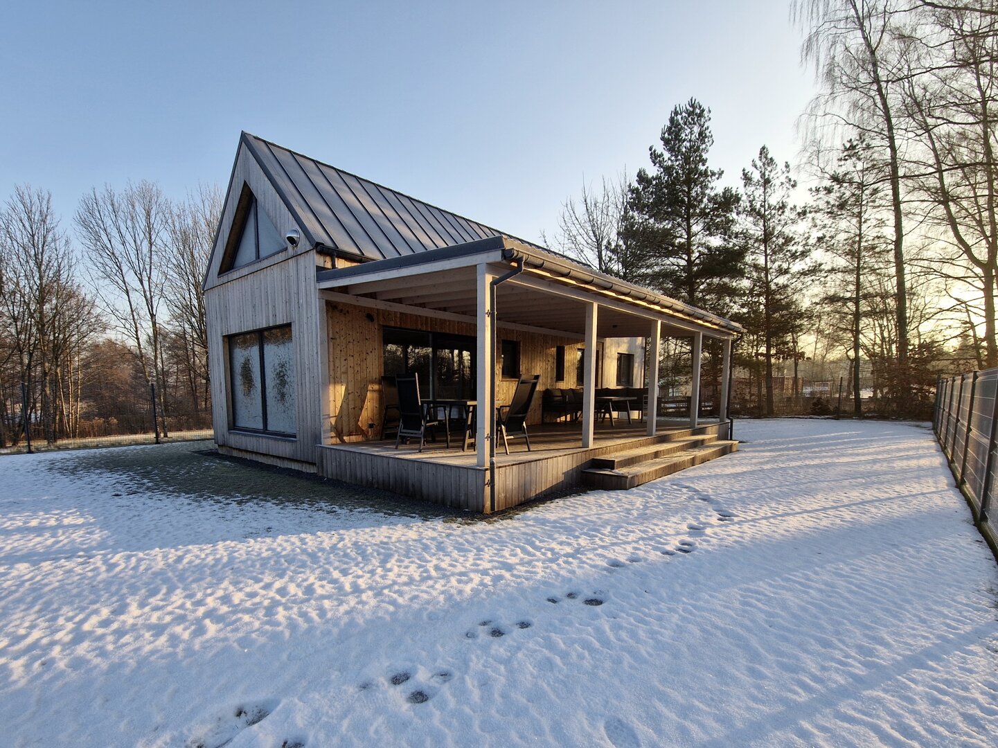 Nowoczesny, całoroczny domek przeznaczony dla maksymalnie 6 osób. Drewniana elewacja w połączeniu z dużymi przeszkleniami nadaje bryle lekkości, a ogrodzony, prywatny teren wokół domku zapewnia swobodę i komfort wypoczynku. Tuż obok domku znajduje się prywatne miejsce parkingowe.