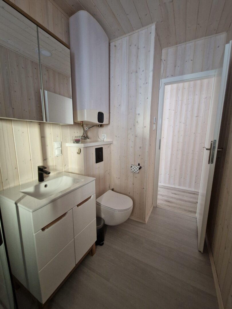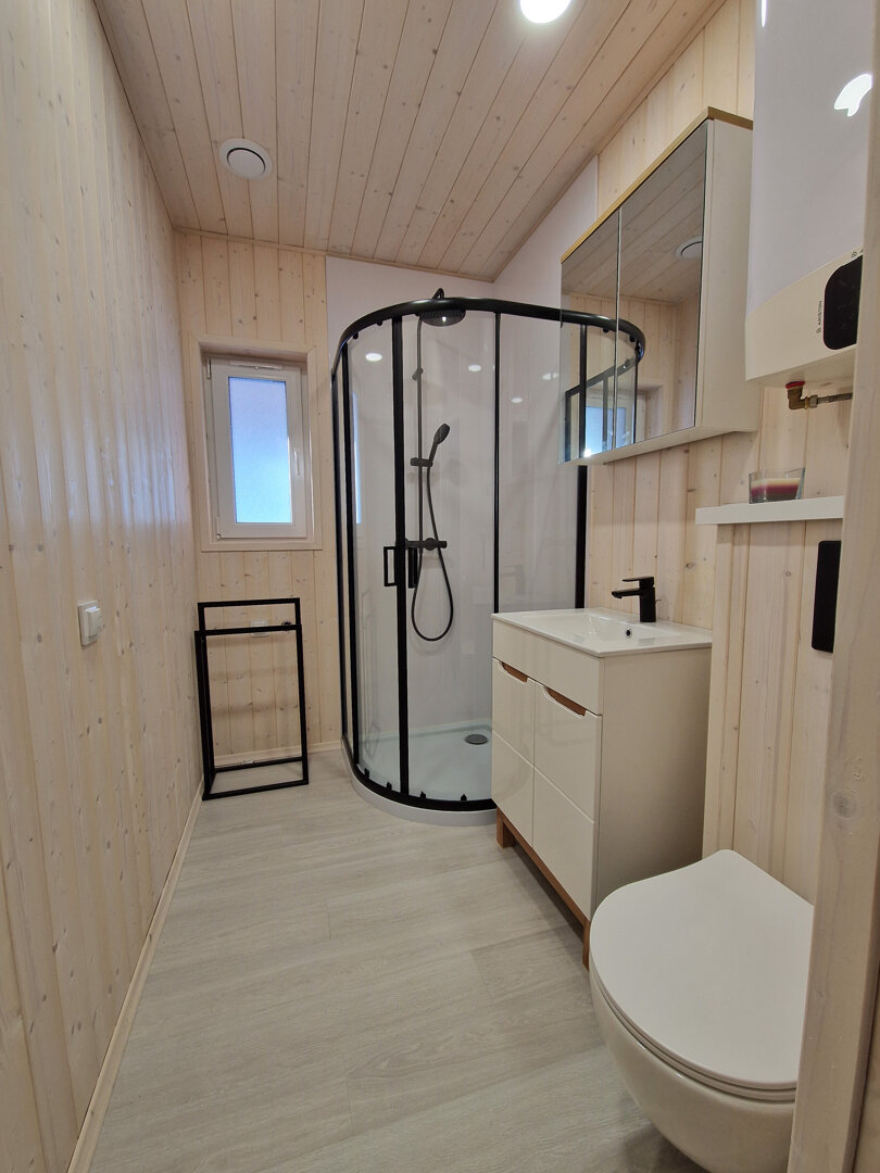 Łazienka utrzymana jest w tej samej, drewnianej stylistyce, co pozostała część wnętrza i została wyposażona w kabinę prysznicową.