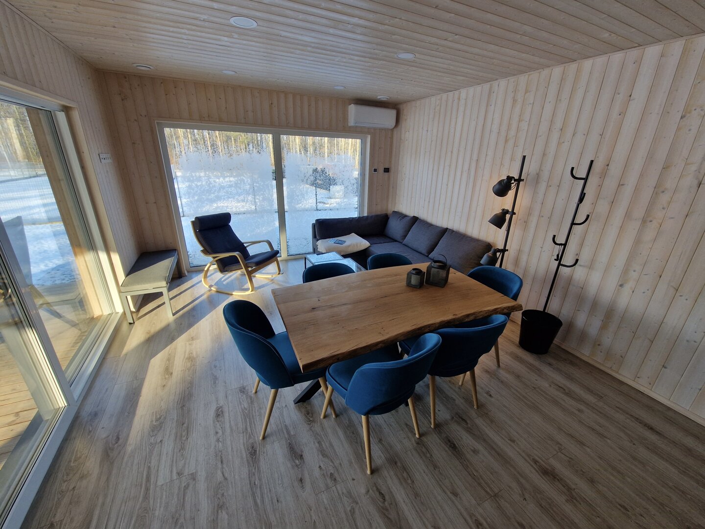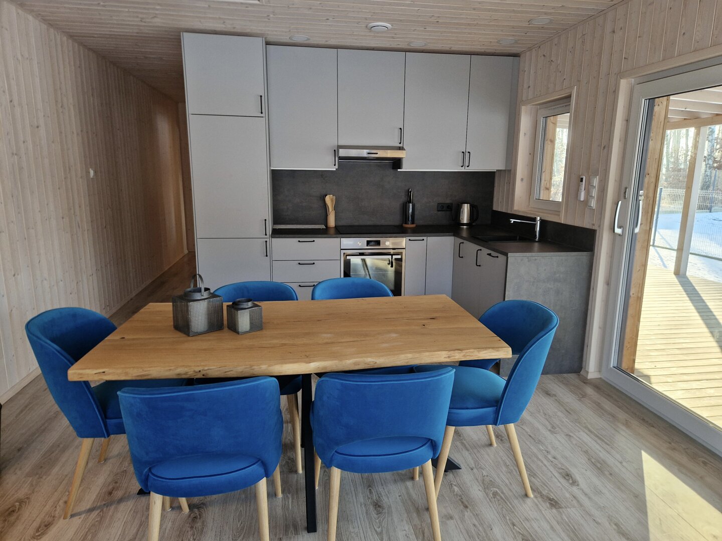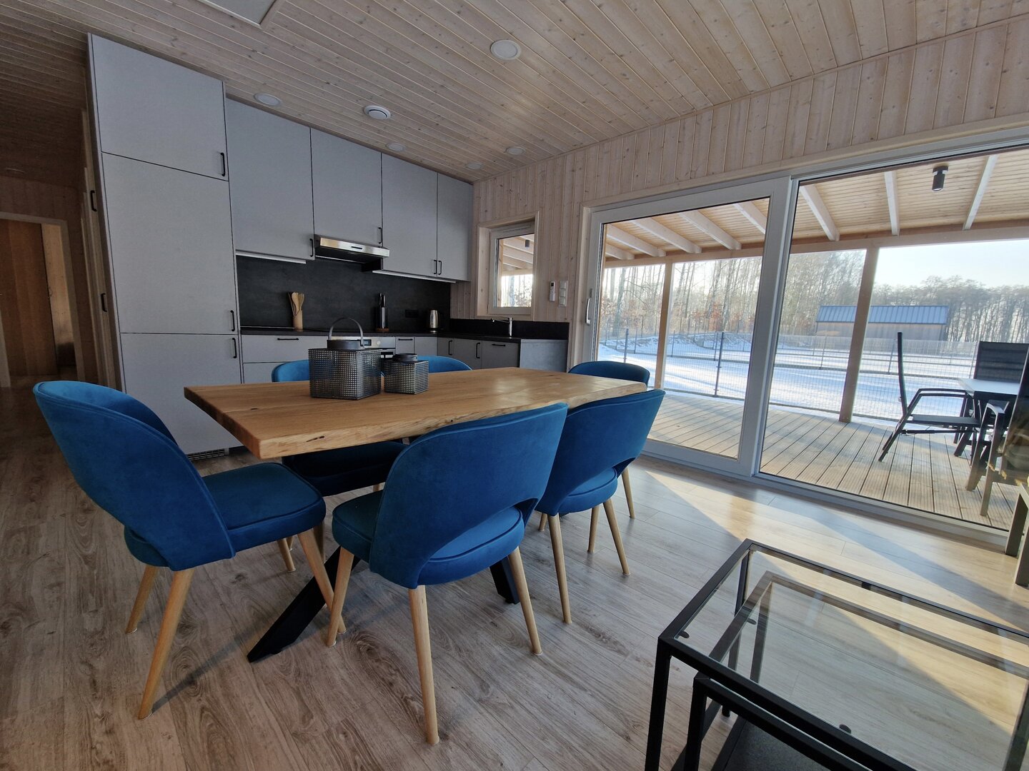 Wnętrze wykończone jasnym świerkiem skandynawskim tworzy spójną, naturalną przestrzeń. Strefa dzienna obejmuje przestronny salon połączony z kuchnią. Znajduje się tu sofa oraz stół jadalniany, a duże przesuwne przeszklenia prowadzą bezpośrednio na taras i zapewniają wnętrzu dużą ilość naturalnego światła.