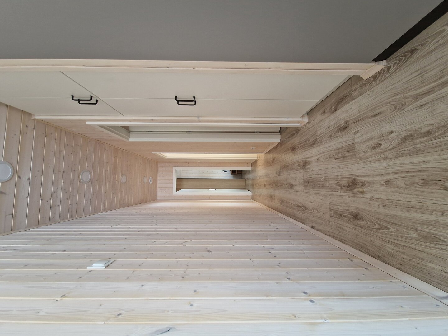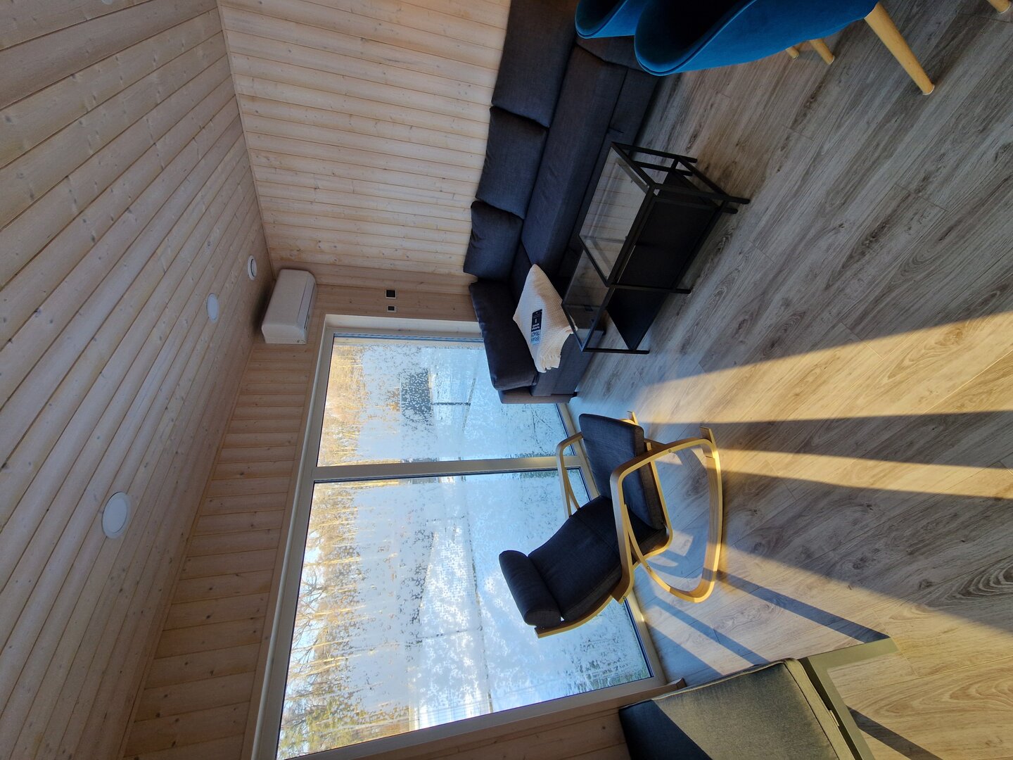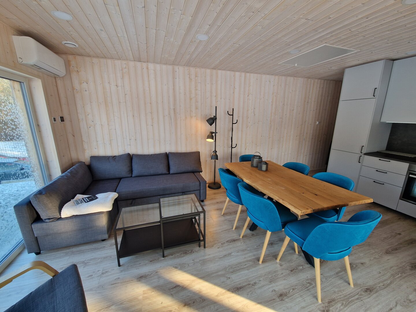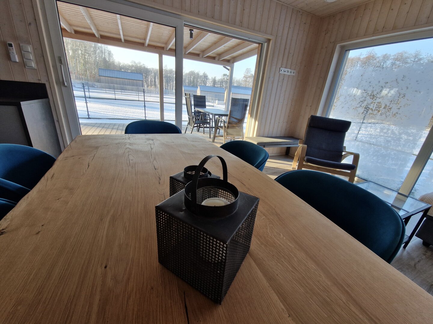 Wnętrze wykończone jasnym świerkiem skandynawskim tworzy spójną, naturalną przestrzeń. Strefa dzienna obejmuje przestronny salon połączony z kuchnią. Znajduje się tu sofa oraz stół jadalniany, a duże przesuwne przeszklenia prowadzą bezpośrednio na taras i zapewniają wnętrzu dużą ilość naturalnego światła.