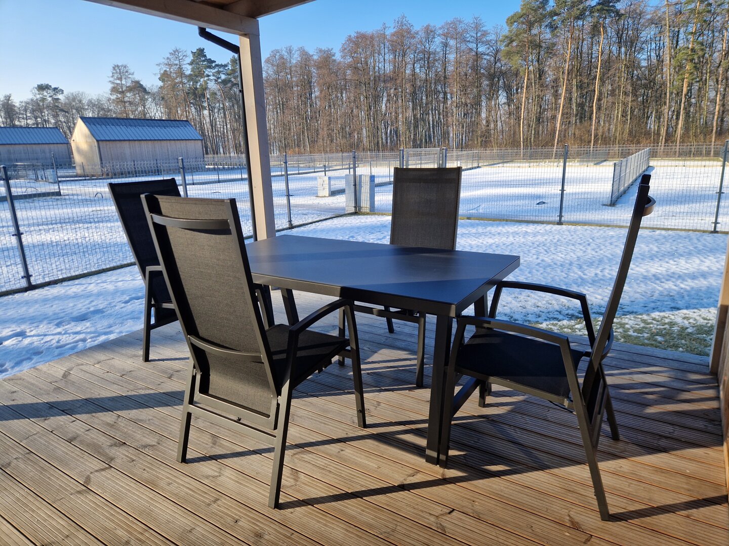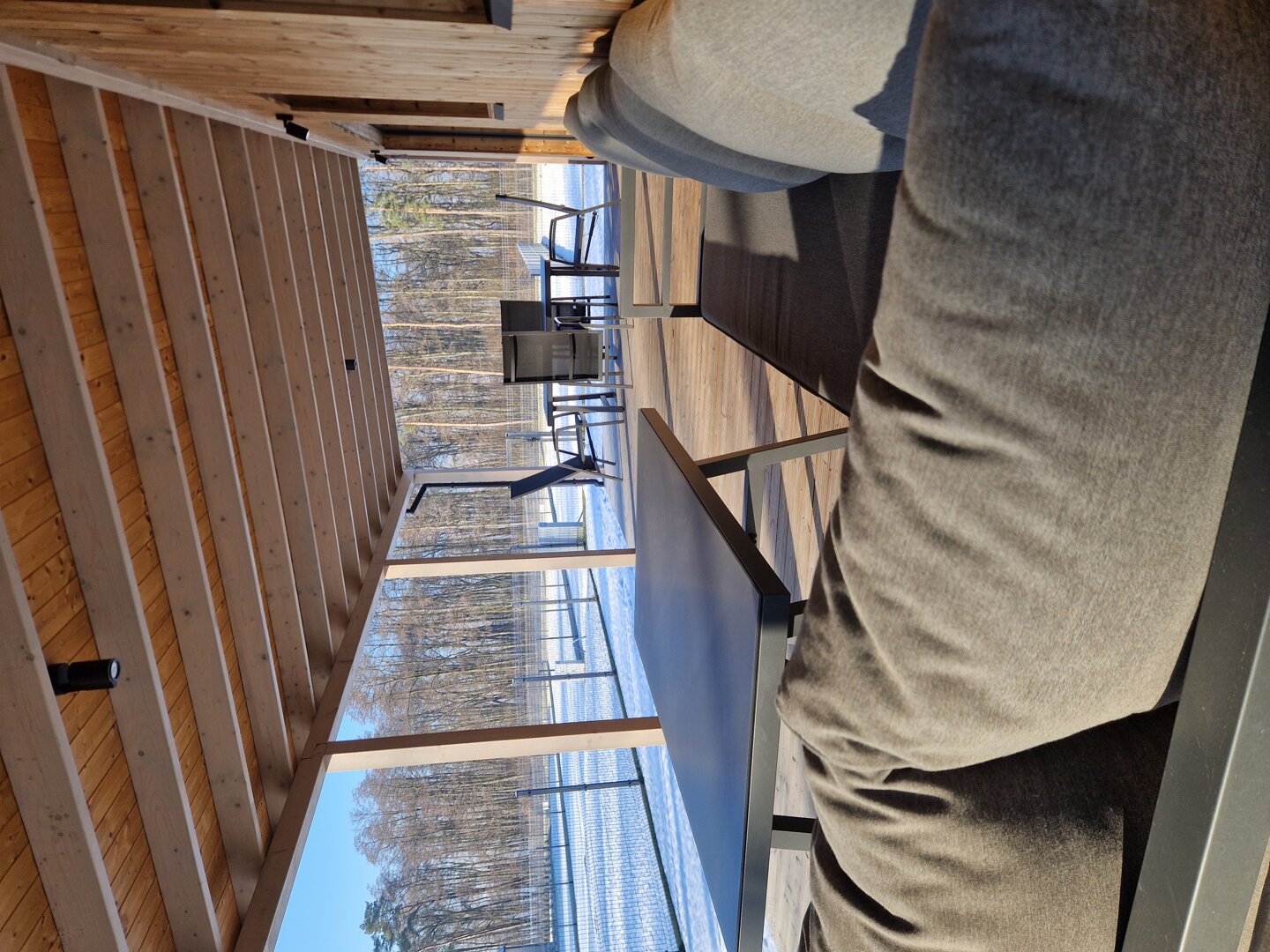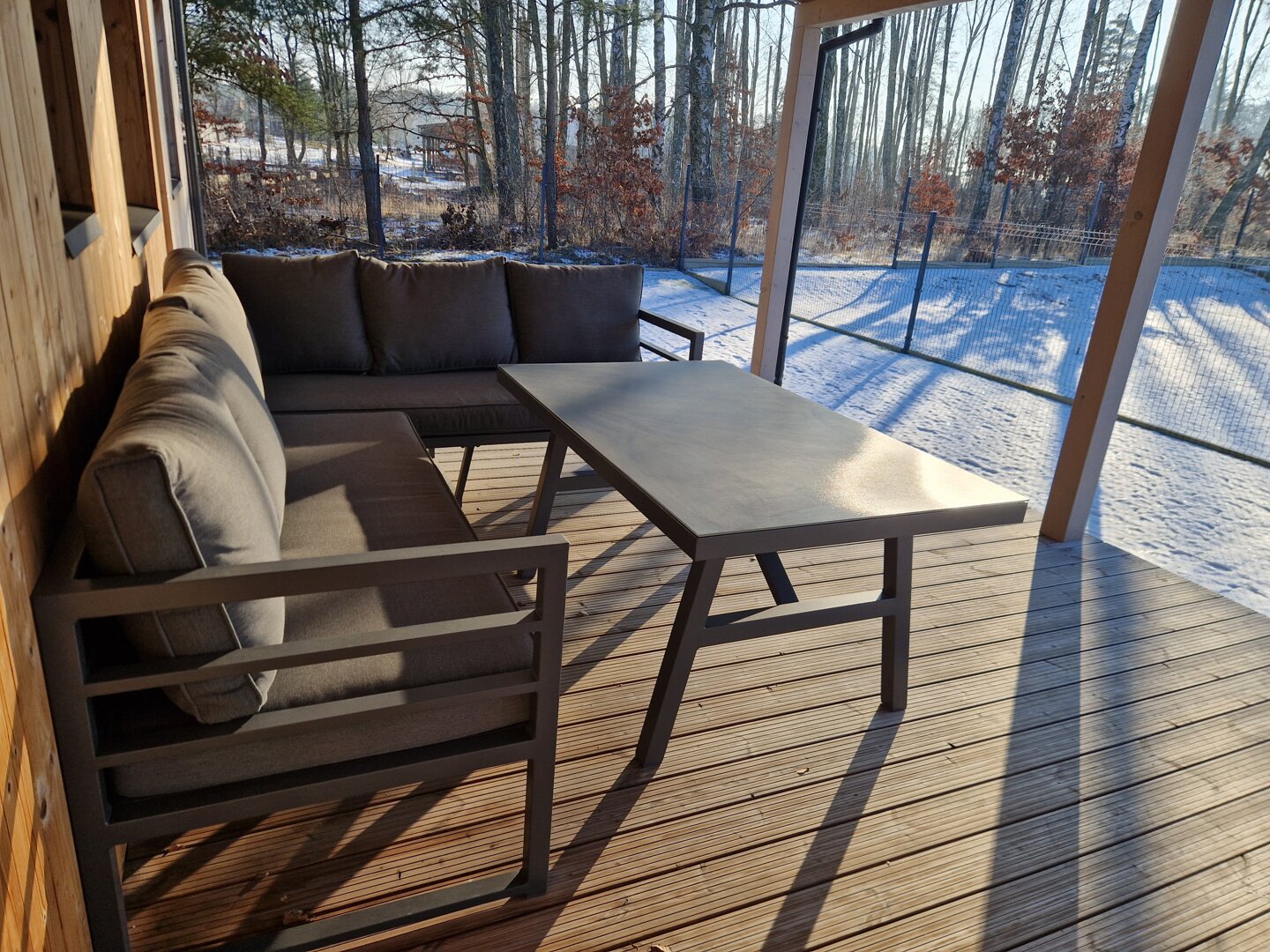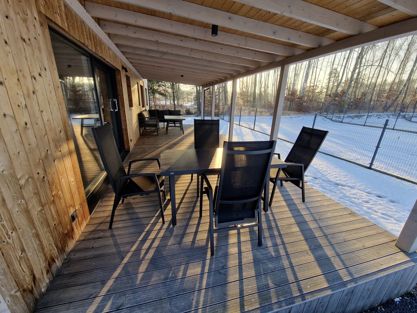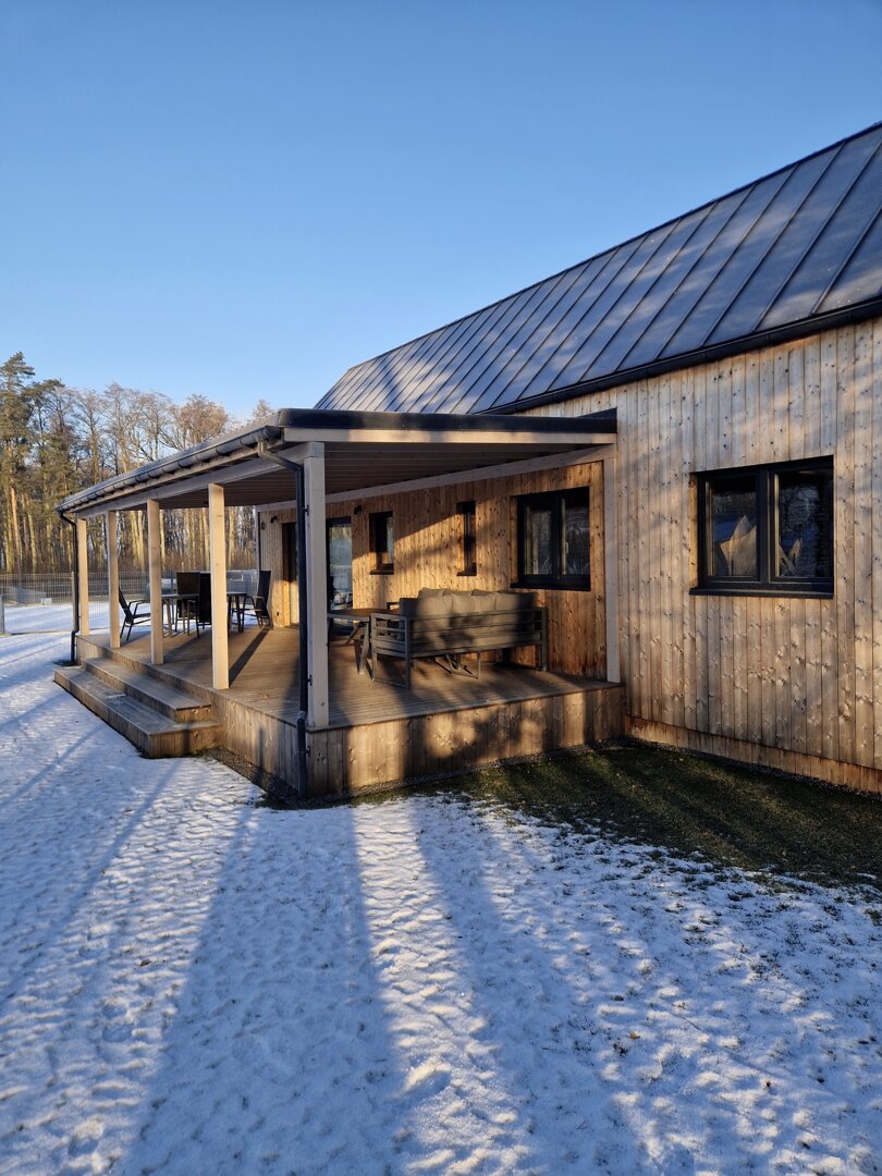 Istotnym elementem domu jest 35-metrowy, zadaszony taras z widokiem na jezioro i las. Znajdują się tutaj stół oraz meble wypoczynkowe, dzięki czemu taras pełni funkcję dodatkowej strefy dziennej. Zadaszenie pozwala korzystać z tej przestrzeni niezależnie od pogody.