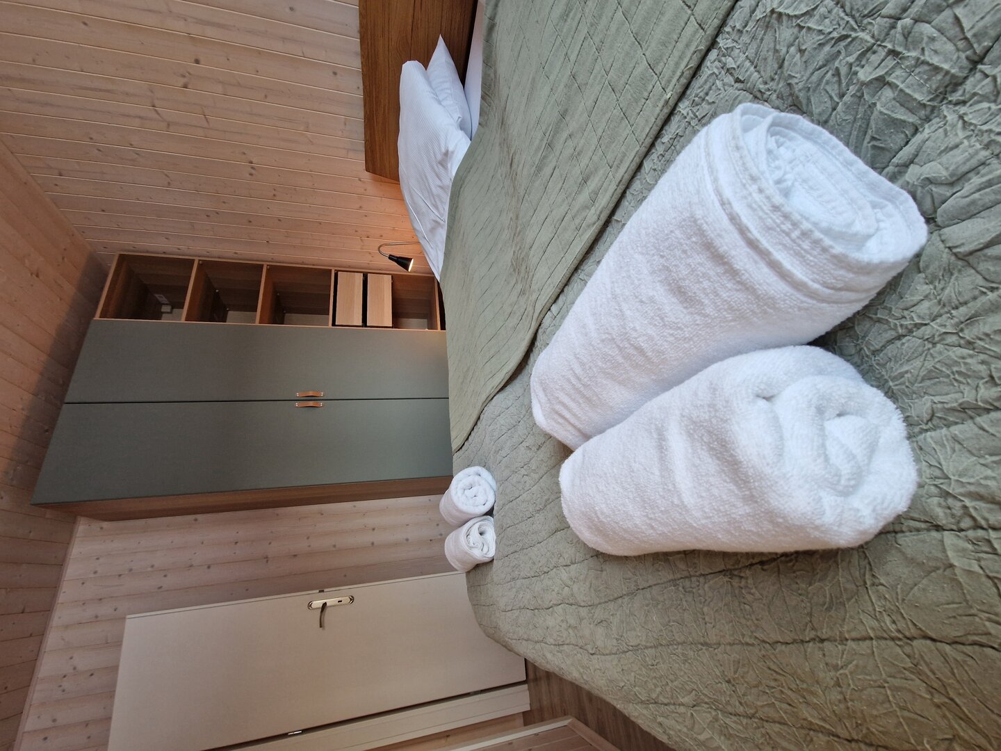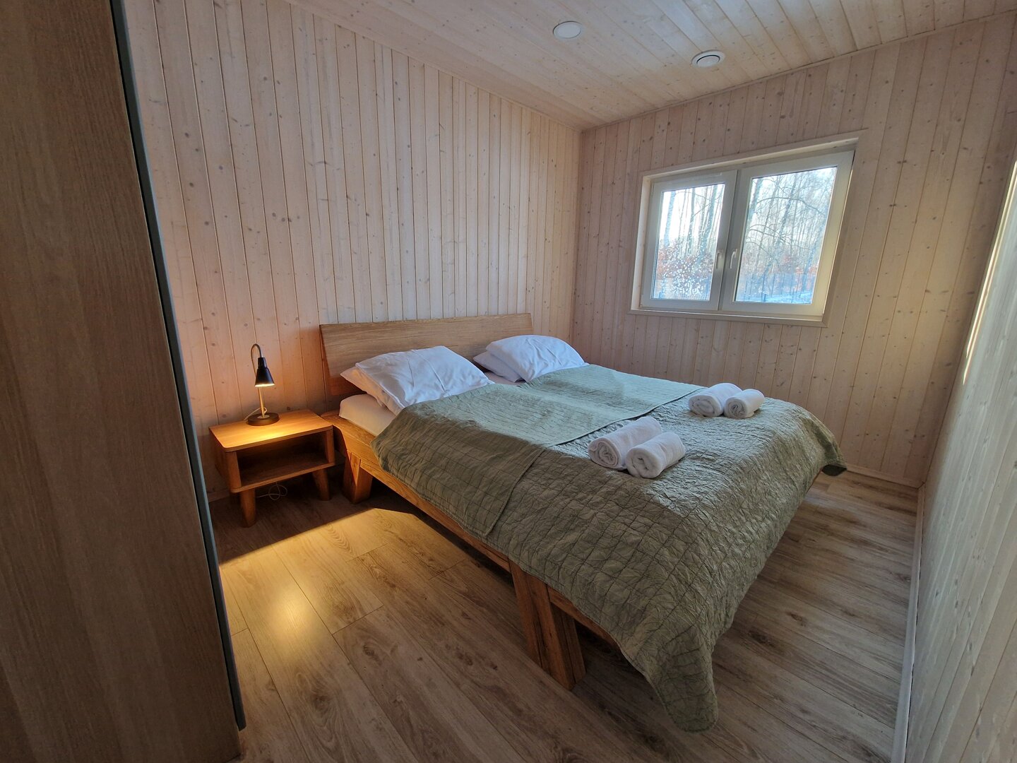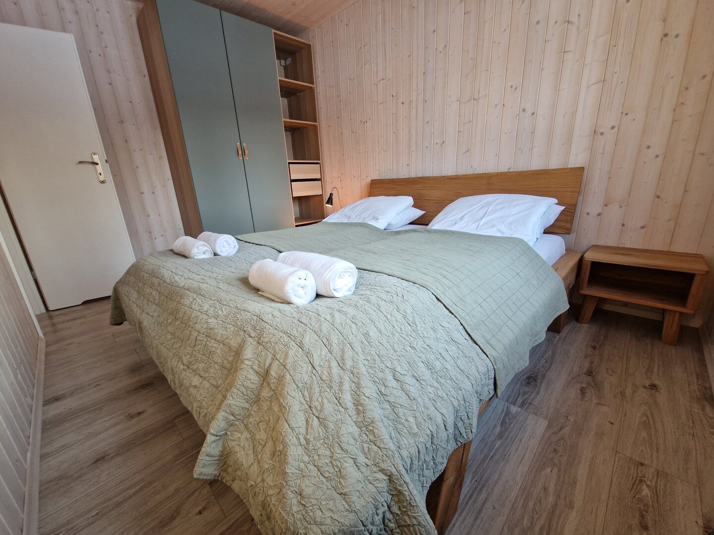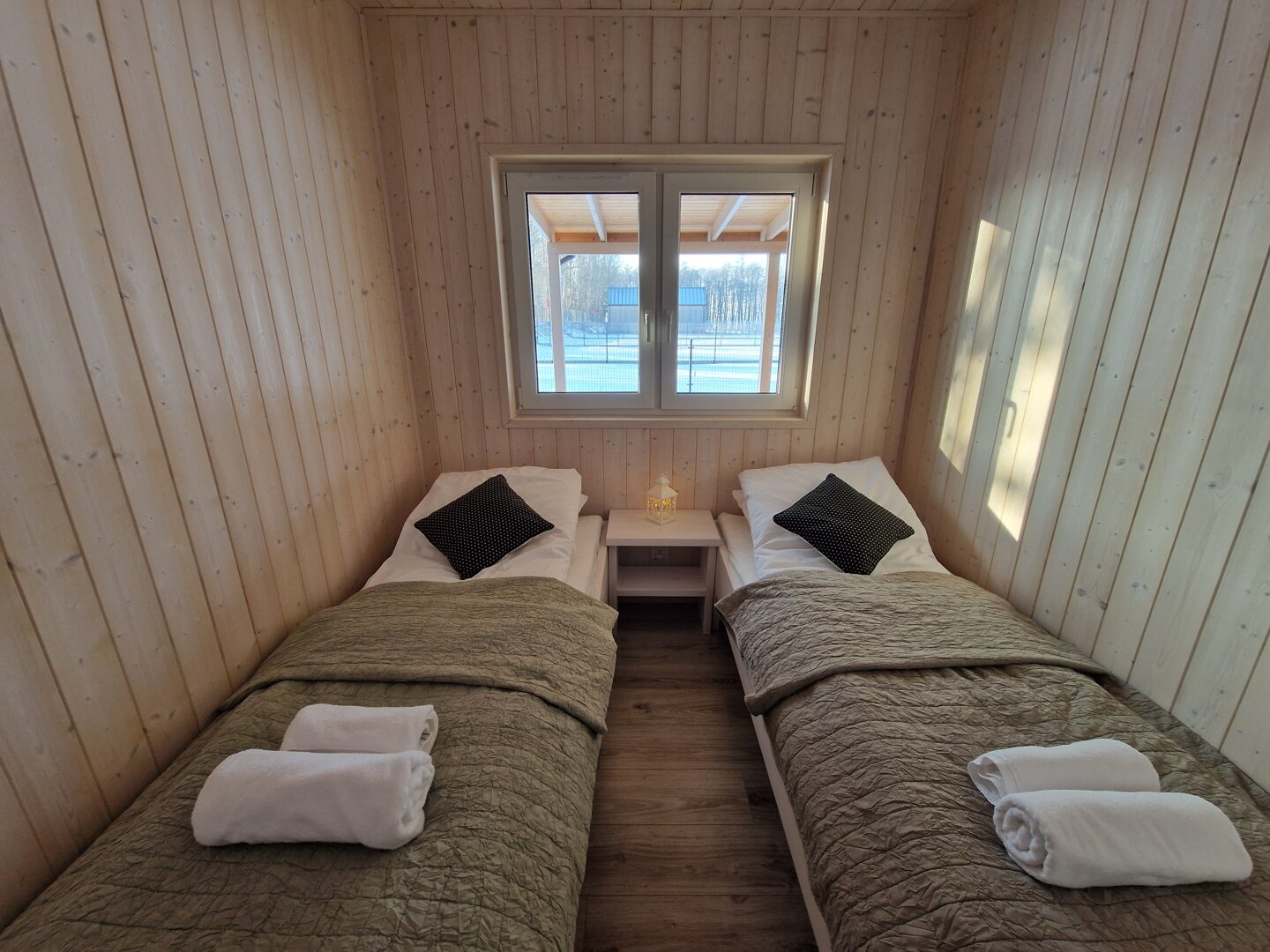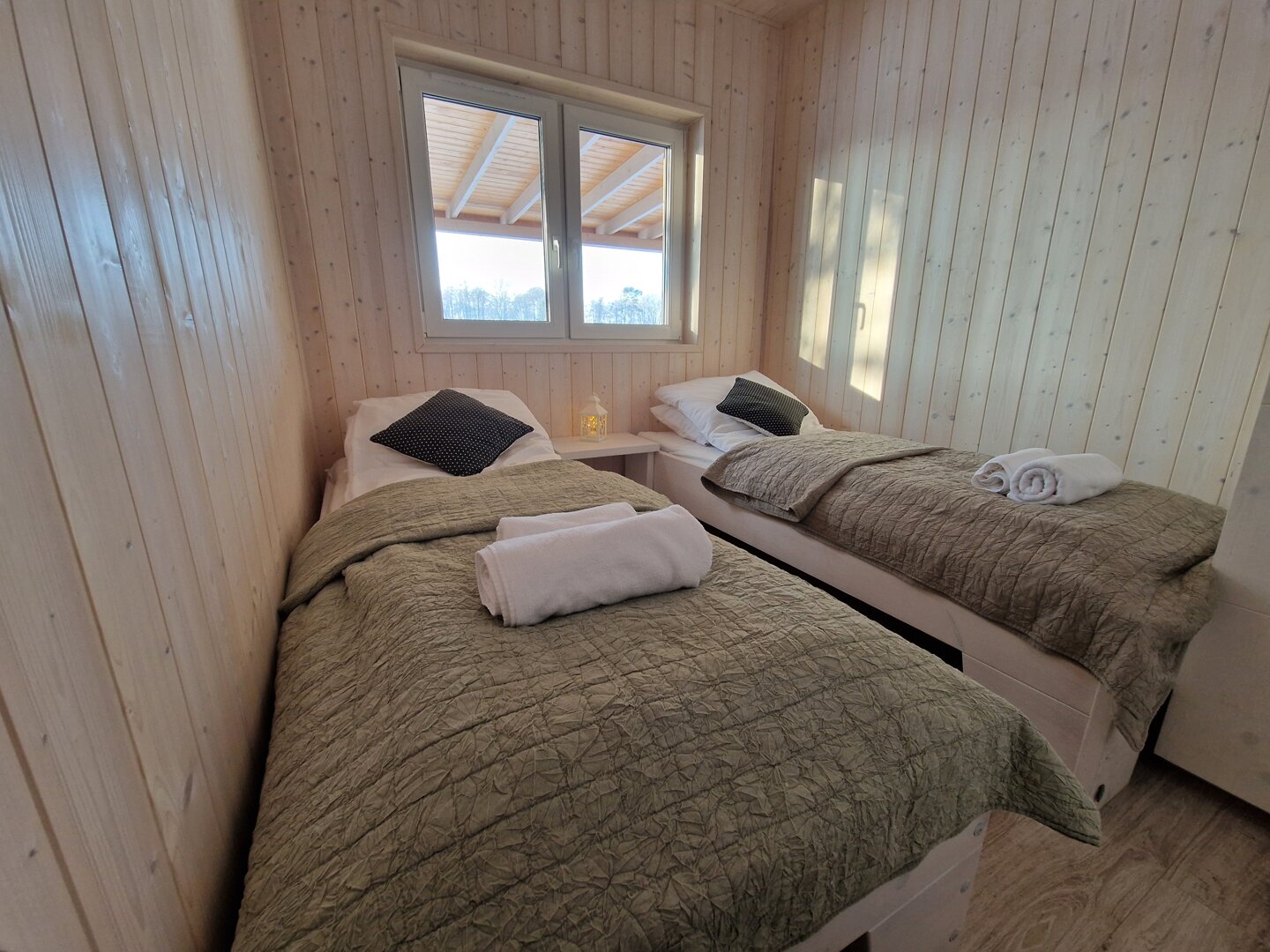 Domek posiada dwie oddzielne sypialnie — jedną z łóżkiem podwójnym oraz drugą z dwoma łóżkami pojedynczymi. Dodatkowe miejsca do spania zapewnia rozkładana sofa w salonie, co pozwala wygodnie zakwaterować do sześciu osób.