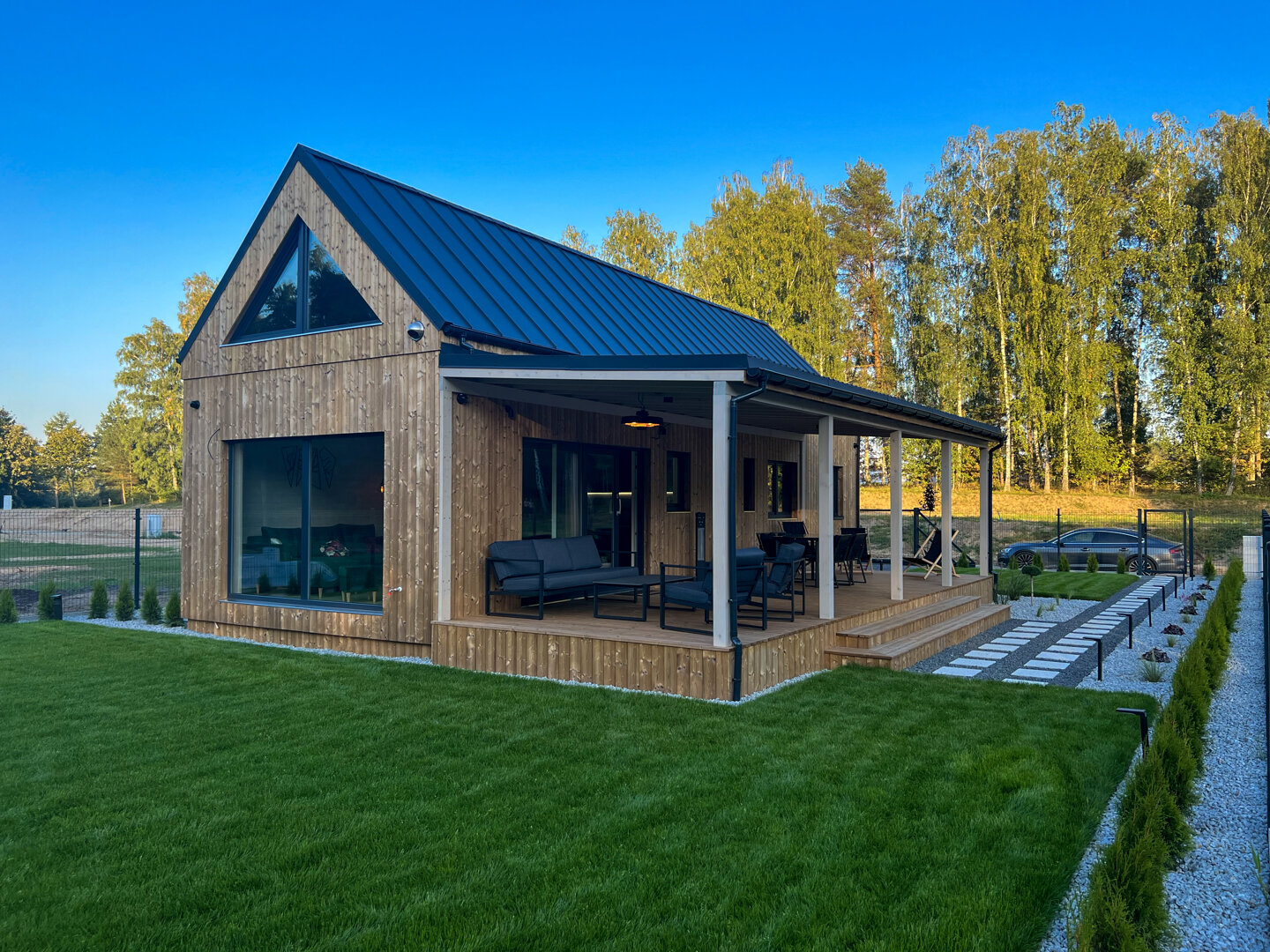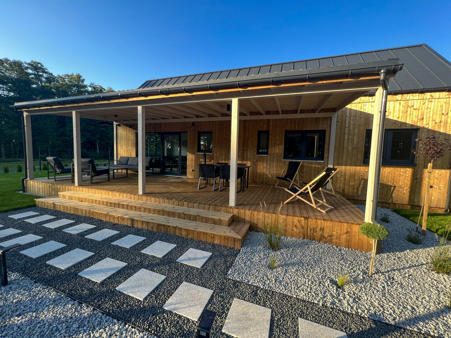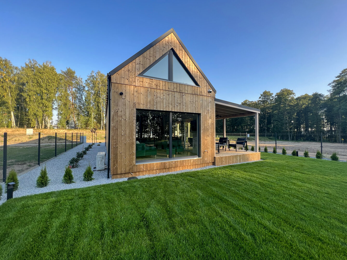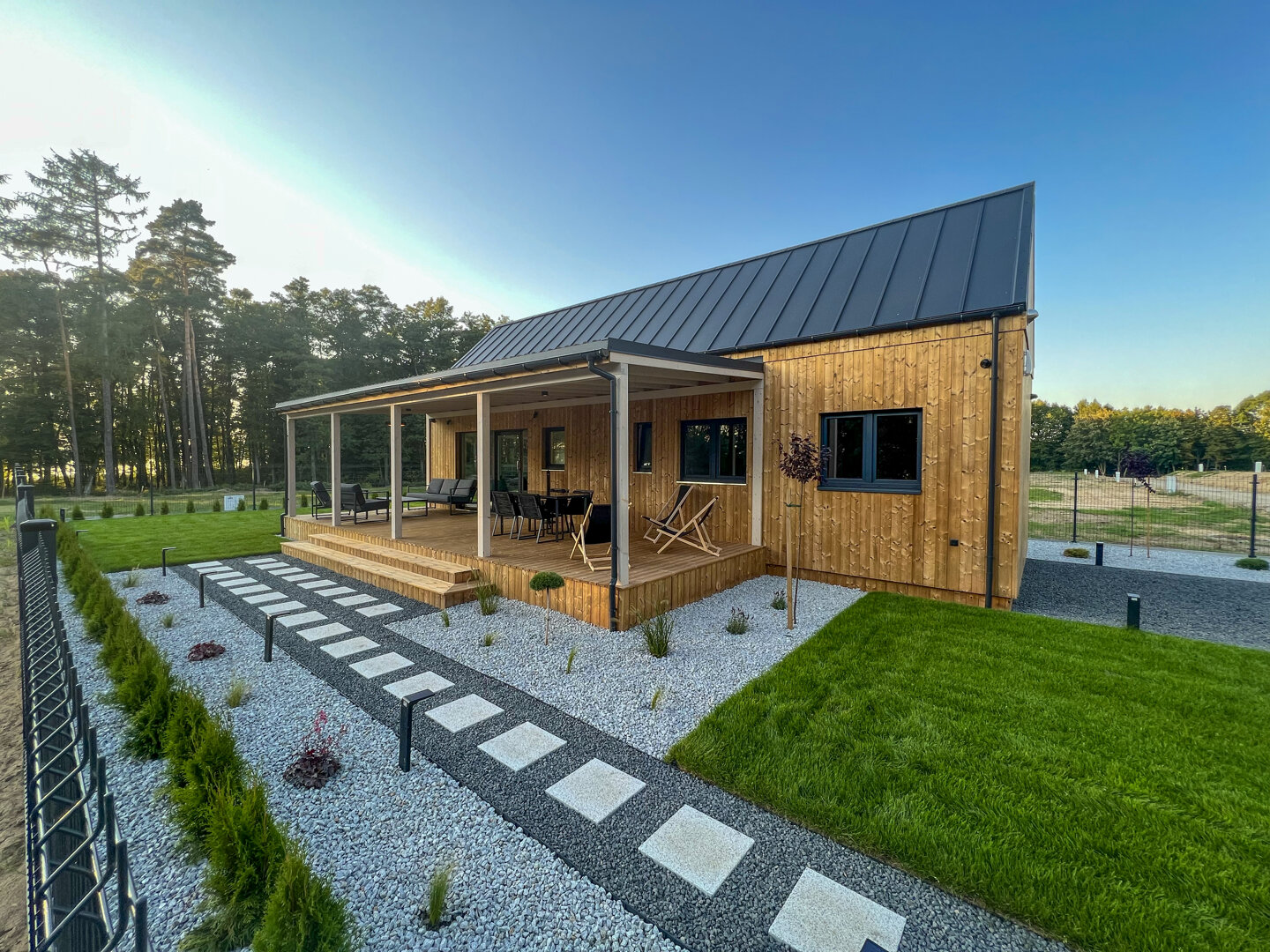 Nowoczesny, całoroczny domek przeznaczony dla maksymalnie 6 osób. Drewniana elewacja w połączeniu z dużymi przeszkleniami nadaje bryle lekkości, a ogrodzony, prywatny teren wokół domku zapewnia swobodę i komfort wypoczynku. Tuż obok domku znajduje się prywatne miejsce parkingowe.