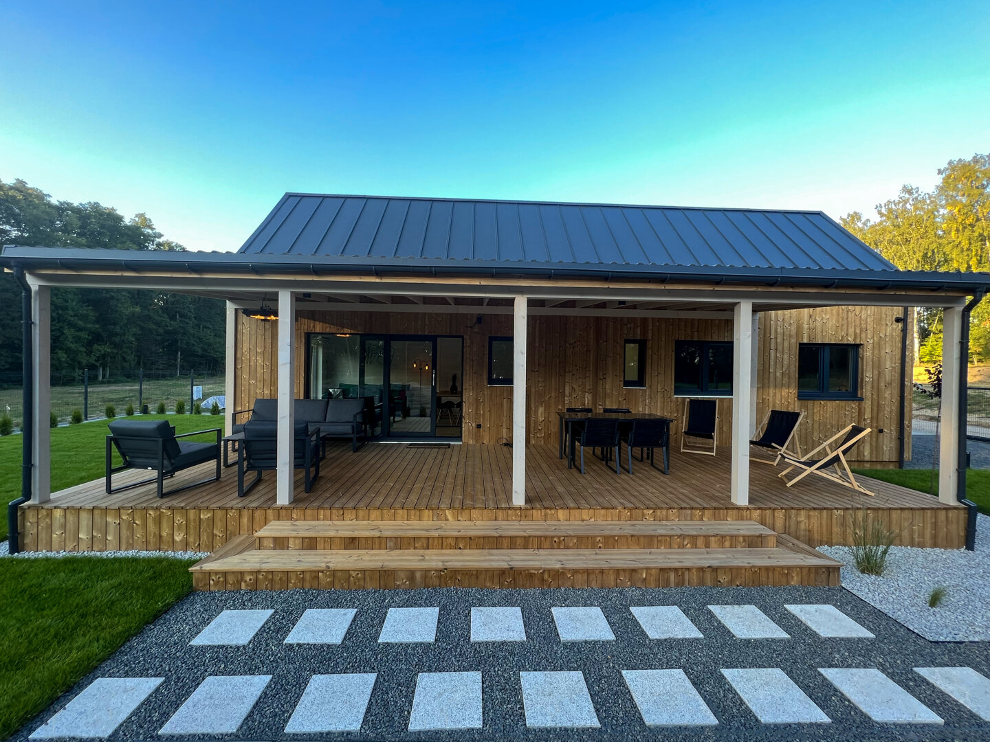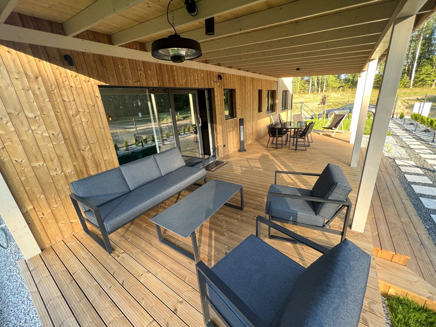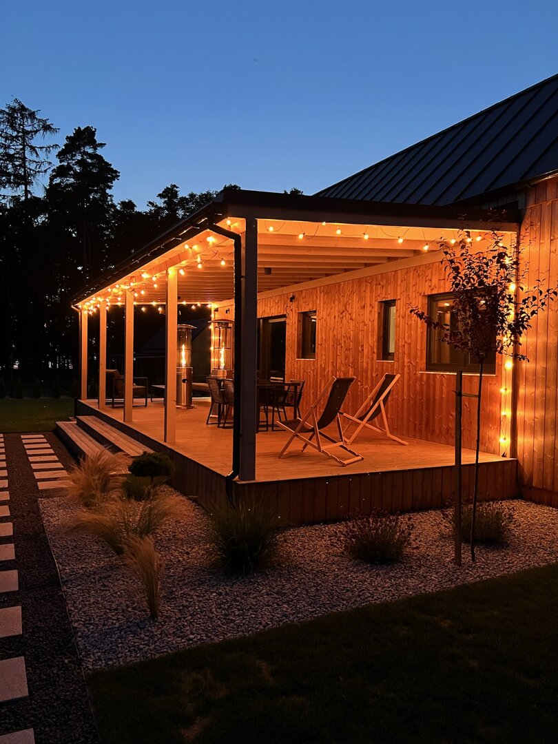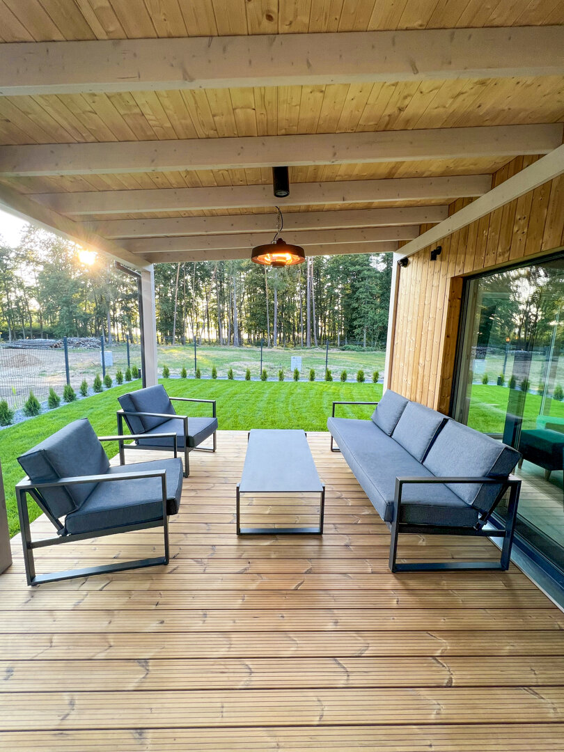Istotnym elementem domu jest 35-metrowy, zadaszony taras z widokiem na jezioro i las. Znajdują się tutaj stół oraz meble wypoczynkowe, dzięki czemu taras pełni funkcję dodatkowej strefy dziennej. Zadaszenie pozwala korzystać z tej przestrzeni niezależnie od pogody.