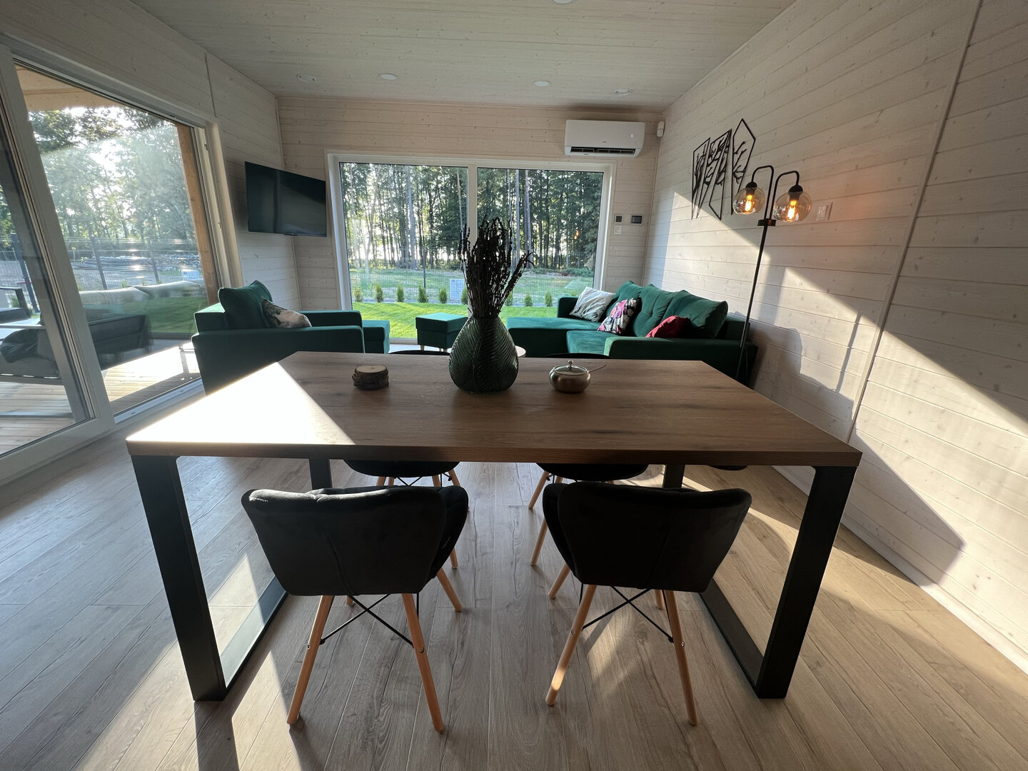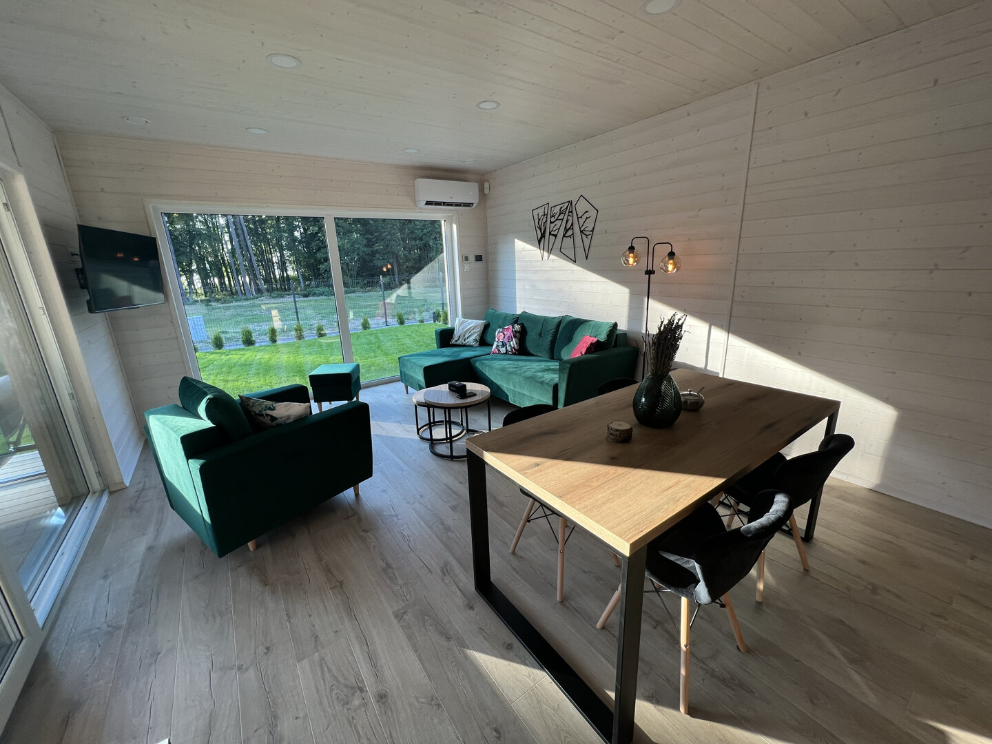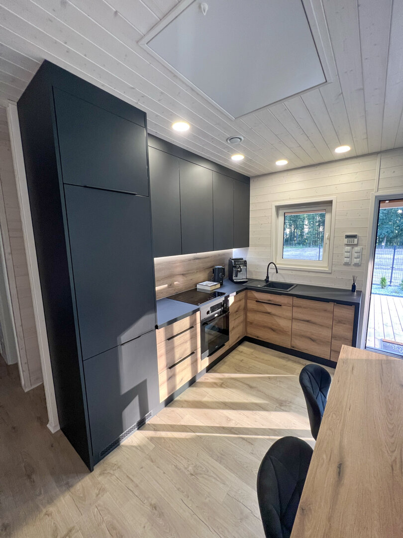 Wnętrze wykończone jasnym świerkiem skandynawskim tworzy spójną, naturalną przestrzeń. Strefa dzienna obejmuje przestronny salon połączony z kuchnią. Znajduje się tu sofa oraz stół jadalniany, a duże przesuwne przeszklenia prowadzą bezpośrednio na taras i zapewniają wnętrzu dużą ilość naturalnego światła.