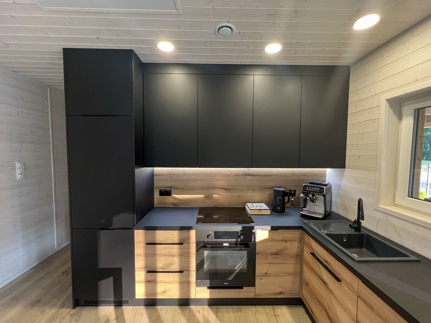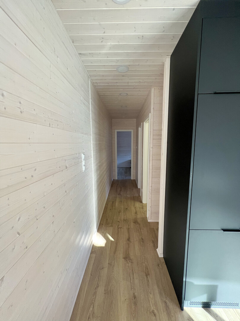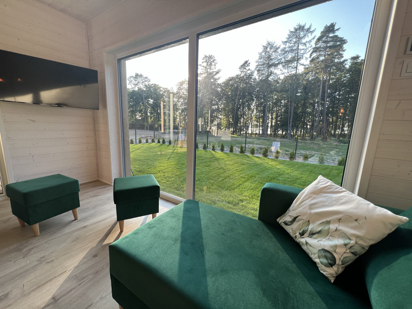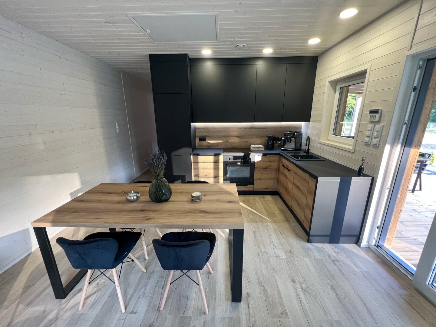 Wnętrze wykończone jasnym świerkiem skandynawskim tworzy spójną, naturalną przestrzeń. Strefa dzienna obejmuje przestronny salon połączony z kuchnią. Znajduje się tu sofa oraz stół jadalniany, a duże przesuwne przeszklenia prowadzą bezpośrednio na taras i zapewniają wnętrzu dużą ilość naturalnego światła.