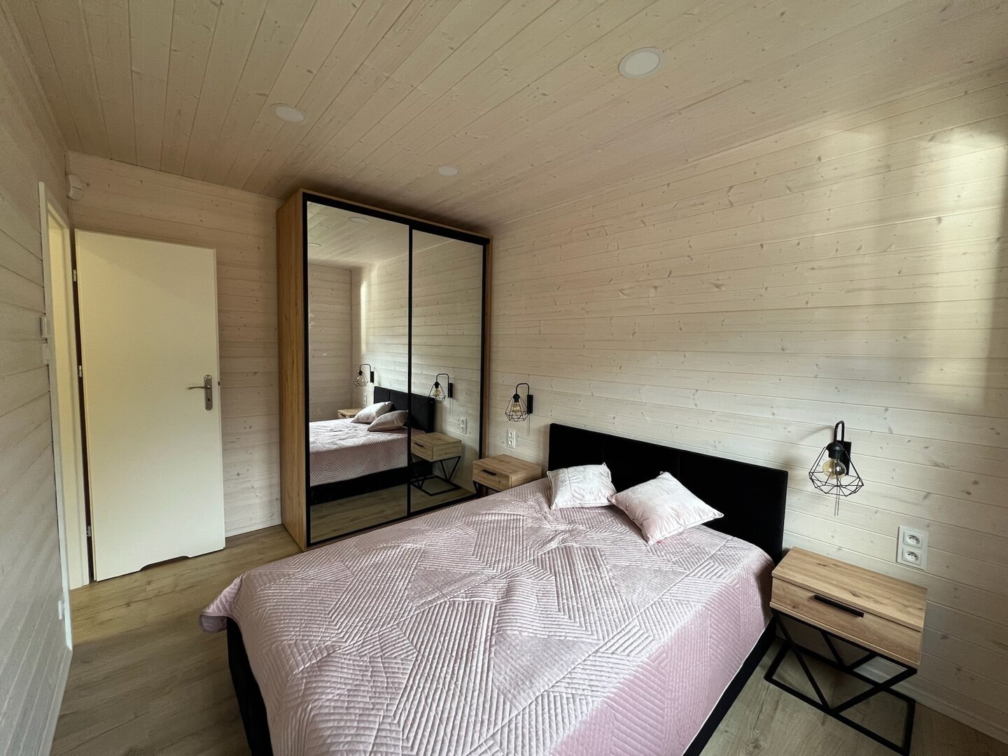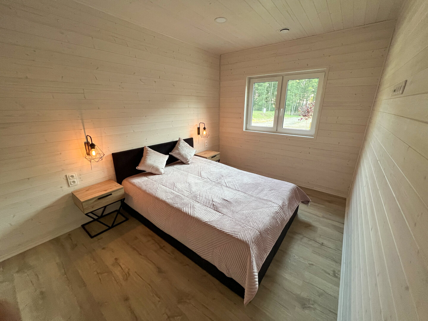 Domek posiada dwie oddzielne sypialnie — jedną z łóżkiem podwójnym oraz drugą z dwoma łóżkami pojedynczymi. Dodatkowe miejsca do spania zapewnia rozkładana sofa w salonie, co pozwala wygodnie zakwaterować do sześciu osób.