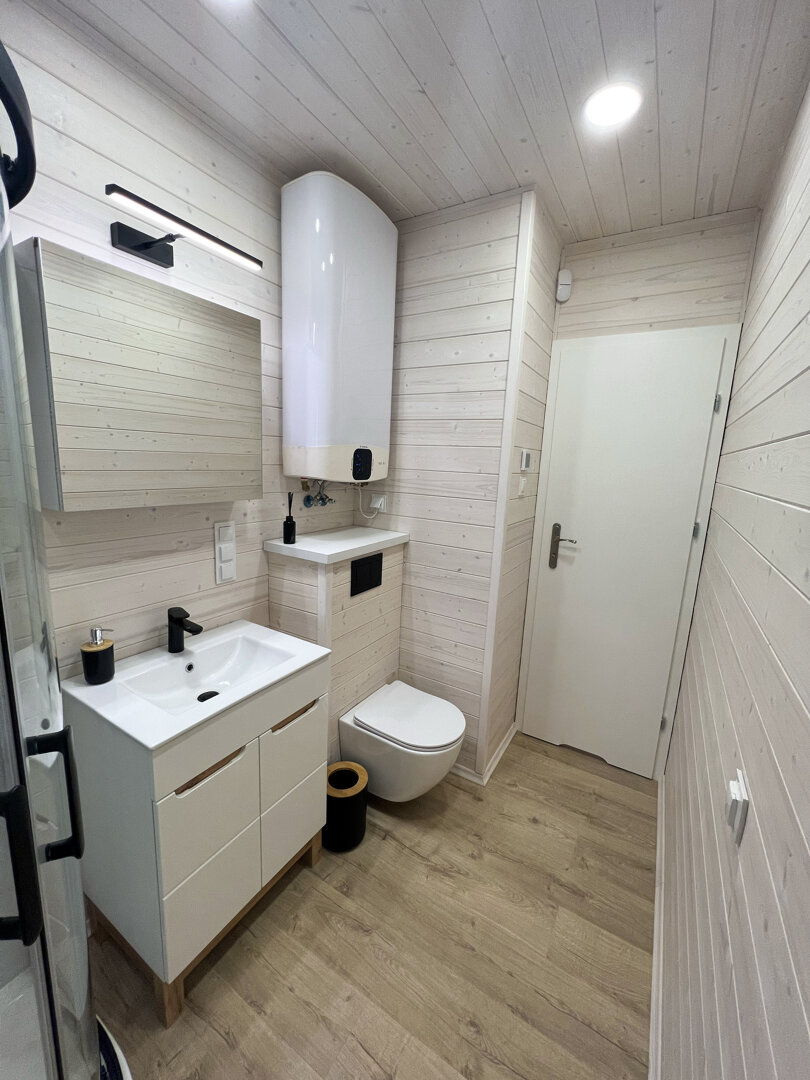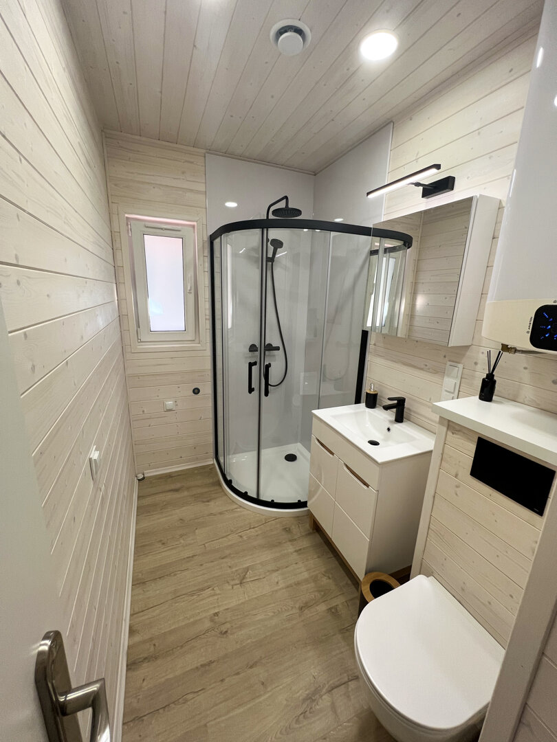 Łazienka utrzymana jest w tej samej, drewnianej stylistyce, co pozostała część wnętrza i została wyposażona w kabinę prysznicową.